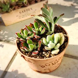 昨日先輩より頂いた新入りさんを招き、ちょっと早いけど5号鉢に寄せ植え🍀 属と株サイズとで出来るだけ似た者同士にしたつもり…😅