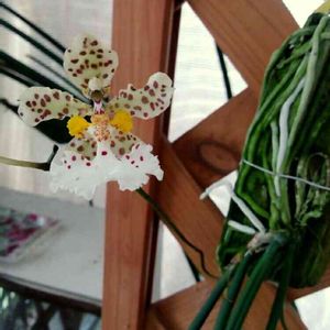 Trichocentrum jonesianum ネギみたいな変わった株姿の蘭から面白い花が咲いていました😁 根っこも毛がフサフサで白く光っているみたいです❕