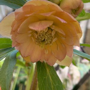 最近、うちのメンバーになったクリスマスローズ ダブルアプリコットピコティ多弁さん、指使わずに撮影するとこんな感じ😅 お顔は見えないけど雰囲気はわかりますかね?うち一番のフリフリさんです💕💕 咲き始めはピンク色が強めですが、咲き進むとだんだんアプリコット色が強くなってきています😊