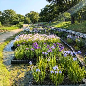 長居植物園、最後は花菖蒲✨️✨️ 夕暮れ近くなり、とても綺麗でした☺️ あじさい園の近く、花菖蒲の手前の傘や風鈴の映えスポットも素敵でした😊