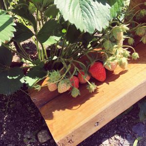 いちごたわわに実る。早く赤くならないかな〜〜(๑´ڡ`๑)小さい実は摘んじゃった方よかったのかな…。 めちゃウマいちごが本当においしいのかも関心事。