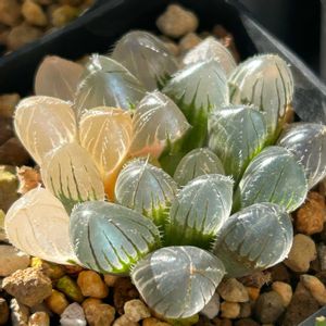 🟨ハオルチア 赤線レンズ錦🟩 最近かなり涼しくなってきて、ハオルチアの調子が格段に良くなりました。この株も、夏の間はしなしな茶色でしたが、こんなプリプリの美味しそうな葉っぱに戻りました☺️やっぱり、ハオルチアは特に冬に美しい属ですね。 しかも青光りもしていて、光に透かした窓が美しいです🔵✨ 斑のまわりがもっと良くなればな完璧なんですけどねぇ。 🏷️斑入り見つけ隊♪