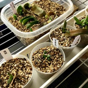 連投ですが、先程の葉挿しゾーンから発根したり発芽すると写真奥のタッパーに移してます♪(´ε` ) そこから親葉が枯れたり、ある程度のサイズになったら独立です(● ˃̶͈̀ロ˂̶͈́)੭ꠥ⁾⁾