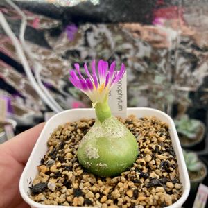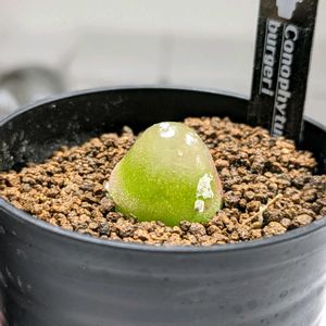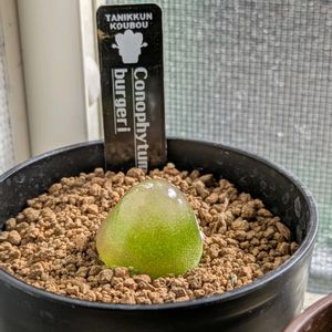 コノフィツム・ブルゲリさんをお迎えしました。 実は、このコ2代目。初代は買った翌日にお外に出していたら鳥に食べられてしまいました(泣) かなり癖のある多肉さんとのことなので、末永くお付き合いしてゆこうと思いますヽ(°ω°)ノ