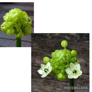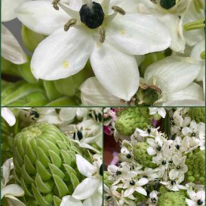 金曜日の蕾たち~🎶オーニソガラム・サンデルシーの蕾です😊 オーニソガラムは沢山の種類があり、園芸的に栽培されるのは秋植え春咲の球根植物が多いですが、中には多肉植物のジャンルに入っているものもあります。 サンデルシーは、数少ない春植夏咲の球根で、背が高くなるので切り花で流通することも多いようですね~😃 ふんわりとカールした苞に包まれた蕾の中で、一輪だけ開花していますが、グリーンがかった白い花弁に濃い緑の柱頭が可愛いですね~💚😍🤍