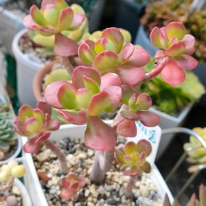 雨で多肉がきれいに見えました☔ でも雨を喜んでいられるのも今のうちですね💦 2月の初めにワークショップで作ったハートのリースもまだ色が鮮やか🩷 ②のリースは昨年の春から秋にかけて、 葉挿しっ子や子株を見つけては植え付けた寄せ集めのリース ピンクルルビーが1つだけ目立ち過ぎ…🙈 少し気温も低くて また可愛く紅葉してくれた 秋麗 高砂の翁 乙女心