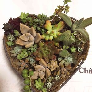 ハート♥️の容器に寄せ植えしたくて💦 100均のハート♥️型のワイヤーカゴにココシートを敷いてその上に多肉植物用の土を入れました。 欲しかったピンクルルビーを中心に寄せ植えしてみました😊 蛍光灯の下での撮影なので色がイマイチ😭