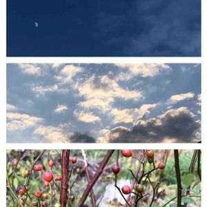 2022年 大晦日の空(15:45) 月と雲と青空と野薔薇の赤い実❤️