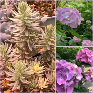 おはようございます😃 今日もいい天気🌞で嬉しい😆 カメレオン錦✨✨ 冬に⭐️になりかけた子ですが、✂️して挿しておいた子が残ったので全部合わせて植えました👍 今は元気いっぱいでかわいい🥰 昨日、紫陽花を見に行きました😊 こんな色の紫陽花が好きかな💗