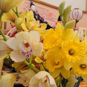 旦那さんのお義母さんが庭のお花の切り花をもって来てくれました☺️ お雛様の所に飾ってます🎵 スイセンとユリのお花🥰