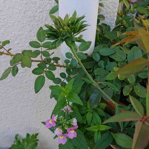 グリーンアイスの鉢からネメシアがこぼれ種子で咲いてました。 写ってるバラはグリーンアイスではなくてグリーンローズです。 鉢の中だとこんなに簡単にこぼれ種で咲くんですね。