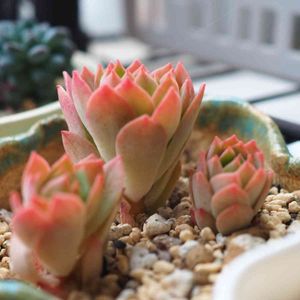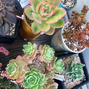 多肉テーブルで、目のつくおふたりさんに 色が可愛いくなってきたー😊 植え替えしてないので下葉は枯れかれですが…