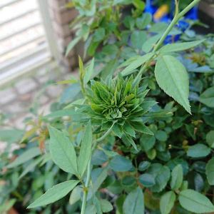 グリーンローズ 一昨年の5月頃ホームセンターで見つけて枯れ枝状態のを店員さんに「この子の生きてますか?」って聞いたのを思い出しました(笑) これは通販で家に来て貰ったコです。 めっちゃ葉っぱですね(笑) けど良く咲いてます。 後ろに子供のまとめてミニトマト鉢が💦