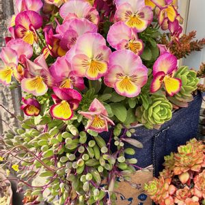 11月に寄せ植えた②が4ヶ月で①に変身❣️ コレだからお花も多肉もやめられません٩̋(๑˃́ꇴ˂̀๑) 中輪パンジーは盛盛に、飾り程度に挿したルビネも盛盛に、ヤケクソで投入した徒長しておブス化した多肉グリーンローズも整って可愛くなりました🥰 健康的なルビネは、茎の🟣と葉の🟢の2色で美しいです ③は根詰まりこの上ないであろうルビーネックレス達。ルビネを挿し穂で増やそうと黒ビニポに挿したまま数年放置するとこの状態になります😅ずっと紅いのも置いておきたいけれど、今年はそっと鉢上げしようと思います。