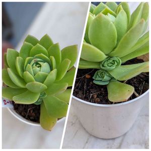 今日から5月😳🌟早い!! 今月もよろしくお願いいたします🐸🍀 寄植えのメンバーチェンジしました🐸 新メンバーも加わって賑やかになりました😊 皆さんの素敵な寄植えのように立体的ではないですが、自己満足です🥳 先日徒長した葉っぱを採ったブルーサプライズとオンスローを比べたら、オンスローの方がだいぶ大きかったのでお一人様になりました🏠 前列㊧のちょっと寂しいグループはカットで増やす予定の多肉と、葉挿しのコを入れました。初めての葉挿しの桃太郎もメンバー入りです🐸 前列㊨のラブリーローズは伸びた頭を一つカットして隙間に入れました。葉っぱ3枚採れたので新たな葉挿しが増えました😳