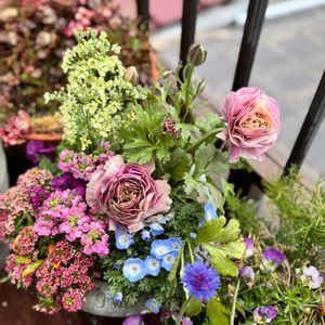 今日の1鉢。 そろそろラナンキュラス、アネモネの季節は終わりだねぇ。 #ラナンキュラストワイライトレディ #ウィンティーライムグリーン #ネモフィラ #プリティーミックス #今日の1鉢 #bot #柏木植物園