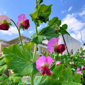 おはようございます。 えんどう豆の花が咲いてました。うすいピンクと赤のハ―フちゃん豆科 の花って綺麗です今年は、収穫出来ると嬉しい😌✨
