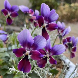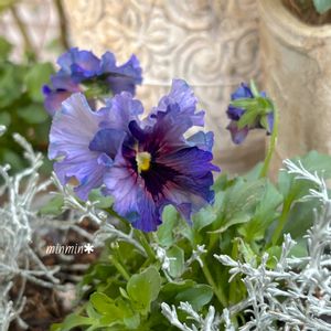 色に一目惚れしたビオラ ミステリアスバニー シルバーブッシュを引き立て役に任命して、植えてみました この色がキープできますように!