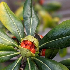 トベラ(扉) トベラ科で東北地方南部以南の海岸に自生する。 枝葉を折ると悪臭を発するため、節分にイワシの頭と共に、魔除けとして戸口に掲げられた👹 そのため扉の木と呼ばれ、これがなまってトベラとなった🚪 粘着質の赤い種子は無味無臭で美味しくなく、🐦もあまり食べない😅