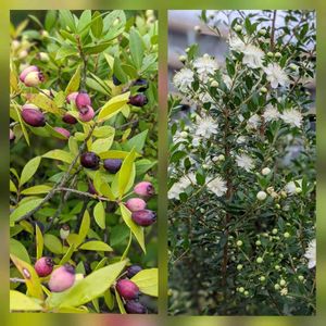 ギンバイカ 同じ株で、花と実がいっぺんに見られました♡❣️ 編集しなくていいように気遣ってくれたのかしら😅