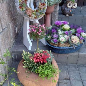 🎄Xmas🎄&🎍正月🎍 盆栽鉢に葉牡丹 多肉リースのスタンドはdiy🧑🏫 ハート♡の鉢には 🌸ぎょりゅう梅🌸 🌿ロータスプリムストーン🌿 ❤️オタフクナンテン❤️ 🌿サントリーナ🌿 🌿ホックスリータイム🌿 🌿ミルキーウエイ🌿