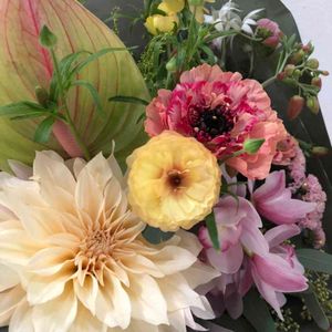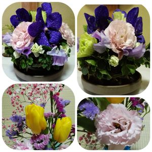 上2枚は今日のレッスン 下2枚は先週生けた花々。まだまだきれいですよ!😍 右下…トルコキキョウが1本余ったのでプラスしました😉👍