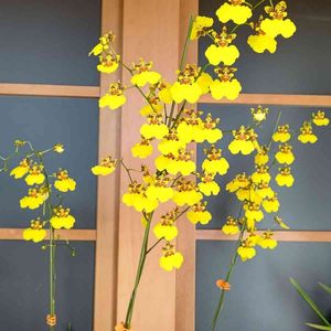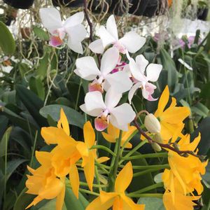 カトレアの花に胡蝶が群れ遊んでいます。 ハンギングの胡蝶蘭が、黄色のカトレアの蜜を求めて集まって来た感じでした。