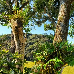 玄関前の大きな木に母が蘭を増やしてます😊白の花びらに真ん中が紫色の蘭のお花が咲くんですよ~(○´∀`○)