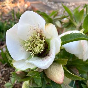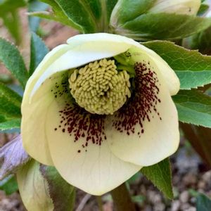 クリスマスローズ 咲いています👀 丸弁のクリーム色花 赤紫色のスポットが入っています♪ 小花タイプ 可愛い😍❤️💕