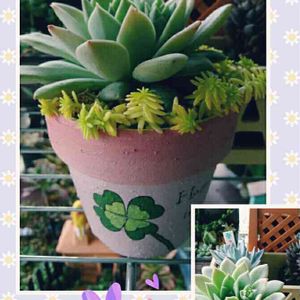 今日は強風です😅 先日桃ちゃんに頂いたリメ鉢…可愛い四つ葉のクローバー🍀に銀武源とセダムミモザを寄植えしました🤗💕 以前教えて頂いたとおり、セダムの回りには水苔をぐるっと置きましたよ〜🤗 桃ちゃんありがとう🎶