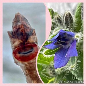 ☆柿の新芽どん。 皆さんのように、中々可愛いのが見つからなくて😅 これでも、口を大きく開けて、応援のエールをおくっています😘 ☆ボリジ 風除室の中でも、最低気温二度の中、また咲き出してくれました(๑・̑◡・̑๑)