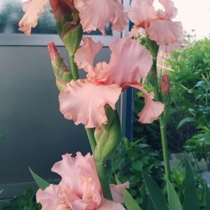 (o゚ω゚o) ついにピンクのジャーマンアイリスが咲きました。 名前はペギースーさん💞 とっても綺麗(✪ω✪) 雨露に濡れて光って見えます✨
