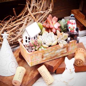自作のミニバウンド缶に寄せ植え。 多肉が少なくスペースが空いてしまったので、セリアのハウスとナチュラルキッチンのスノーマンで埋めました(笑)