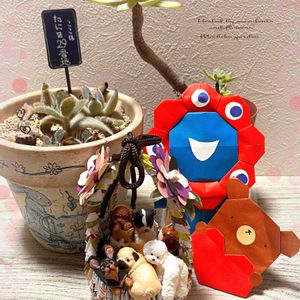 折り紙の日🏷️ 11月11日は「おりがみの日」 数字の「1」が4つ並ぶ日付を 正方形の折り紙の4つの辺に 見立てたことに由来しているそうです またこの日が1918年に 第一次世界大戦の休戦条約が調印された 「世界平和記念日」であり 平和を願う折り紙の心と 通じるとして制定されているそうです ワンワン祭り🏷️ 棒の日🏷️ ウサぴょん祭り🏷️ それから今日は こっそりスネゲボーボーの日🏷️もかな? チンアナゴの日の🏷️もあったので 一緒に投稿させて頂きますね♪ ファンファーレは すごく前からうちにいて (多分2019くらいから) 買った時の葉っぱ部分が 茎が長くなって上の方に行き 下に子供たちがいます この夏すす病になっちゃった⁉️ という感じでしたが 疑惑の葉を取り除き ベニカをかけて様子見中です 2pic目 ボーボーまで行かないけど こっそりとスネゲが生えてました🤭 3pic目 大きめの鉢に植えてあった ジャイアントラビットが 折れたことをきっかけに 色んなウサぴょんの養殖場になっています それぞれが育ってくれることを期待してます🐰💕 4pic目 もう植物0でいいかな?😆 昨日折りたてホヤホヤの ミャクミャク❤️💙 ワンワンが入ったカゴは 定期通院している病院の 患者さんからのプレゼント ❤️持ってるクマさんは だいぶ前に素敵便を下さった フォロワーさんから どなたか分からなくなりました ごめんなさいね〜💦 朝顔は義母のデイサービスの作品 公式でチンアナゴの日でもあるので 海遊館のお土産のチンアナゴも一緒に