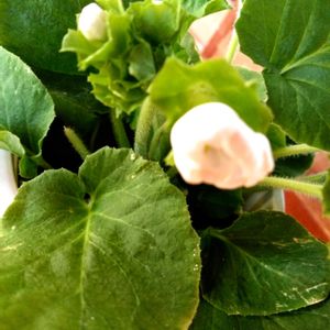 シャンと立ち直って 蕾も 顔をだしてくれました。(オブコニカ) ひとりぼっちじゃ 可愛そうよ と。 (ミニバラ) 2025・1・25 ・9時