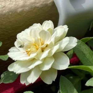 ジニアのプロフュージョンダブルホワイト…のはず。ダブルといっても八重咲きですよね。八重タイプはお花が立派なので当然といえば当然ですが一重のものより花期がとても長いのを育てて初めて知りました。