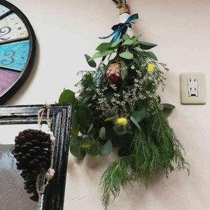 近所の花屋さんでみつくろってもらい、くるくるっと巻いてぶら下げました~ 束ねるだけやと思いきやバランスとか以外に難しいね😅