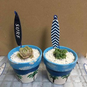 夏っぼくペイントしたリメ鉢に多肉ちゃん植えました(* ´ ェ `*) セリアのサーフボードガーランドをバラして、ボードをワイヤーに通してピックにしました(*´艸`*)