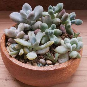 休日の多肉作業 パキフィッツム美人寄せでございます😃 鉢に使用したのは100均で買ったアカシアのサラダボール いつか使ってみたいと思ってて、今回寄せ植え鉢にしてみました😊 本来ならセダムの寄せ植えなんかの方がいいのかも💦