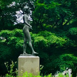 正面から見たら 微妙なバランスを取ってる像🕊✨ 森は護国神社の敷地です