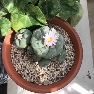 大型烏羽玉 Lophophora williamsii 去年の秋、腐りかけて、今年も色々やらかして花は諦めてたけど咲いてくれました♪