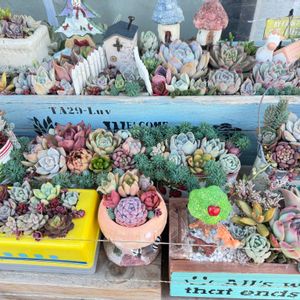 ①久しぶりの寄せ植え🎶 ②多肉棚の寄せ植えコーナー ここの寄せ植え解体して新たに寄せ植えしようと思っていましたが、なんか面倒くさくなって隙間だけ埋めました😂 また秋にやるか‼︎ 知らんけど😆