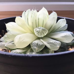 こんにちは☁️ 今年最後の三連休ですね😆 実生の世話と脇芽を摘んだりしていたら日が暮れてきました😳 一体何していたんだろう😅 と思ったのでハオルチアマリン②です✨ こちら側は真っ白&一筋の緑です 上から見ると、、8割がた白斑😌 ここまで白くなくても良いのですが、予想どおり止まりません💦