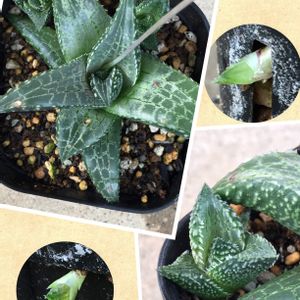 「ハオルチア 瑠璃殿錦」 No. 3 傷みの多い親株ですが全斑の子株を発見! 上手く育てる事は出来ないと思いますけど 親株が残るか子株が残るか分かりませんが 1度は育ててみたいと思っていました👍 他にもキレイな子株が出ると予想しますので 端っこに置かれていたのが今はVIP待遇です