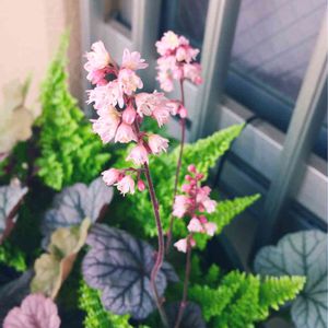 ヒューケラの触覚(花芽)が咲きました〜.*・゚(*º∀º*).゚・*.パア❁❁ 赤いツボミだったので赤い花が咲くと思ってたら、なんとピンク💕 思った以上の可愛さ(♥ω♥*)キュンキュン♡*゜ 葉っぱだけの寄せ植えに華やかさがほんのりプラスされました♡