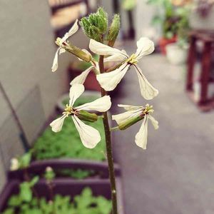 ☘️ルッコラ☘️ 昨年のこぼれ種で冬に芽を出したルッコラには花が咲き、夏に向けて春に芽を出した大葉と、ジャマイカンカラルーの無法地帯🤭