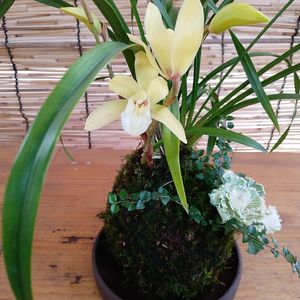 和蘭の苔玉。黄花おぼろ月と葉ボタン