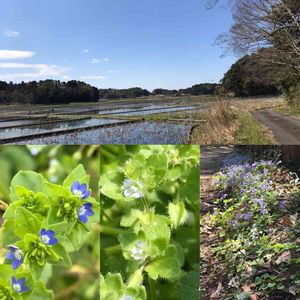 〝花友さんとお散歩 ~♫〟③ ハス田と田んぼが広がる里山の風景 夏には…ハスの葉がワチャワチャと繁って ~白い花が咲くのかな? 古代ハスを生産してる方もいらっしゃるから…ピンク色かな? 少し登って林の中を歩くと ~スミレの小道💜ホッ✨ 感動の時間 ~💕🎶 「私…これからスミレの名前、ちゃんと覚えるようにしようかな💦」 フラサバソウ(オオバコ科)…畑や道ばたに生える3~4㍉の淡青紫色の花♡ 花弁の基部がが合着してる。 萼や葉に毛が多い!! タチイヌノフグリ(オオバコ科)…茎は直立♡ 葉腋につく青色の小さな花は、苞や萼に埋もれたように咲いていた♡🎶 優しい春のひかりの中を…花友さんとのお散歩は嬉しい😋*\(^o^)/*