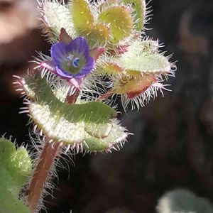 🌱フラサバソウ オオイヌノフグリの傍でまとまって咲いていました。日陰の午前は小さな花をさらにすぼめていましたが、午後下山時には日が当たって開花していました。ガクの毛が特徴的です☺🥰