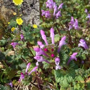 『🐝~💫 虫の目から見下ろす 春の野原は銀河系🌔④❓』 ホトケノザの ユニークな花の形は、小型のハナバチ類が訪花するよう出来上がったものだそうです🐝 ハナバチは、赤紫色を見ることができないので、開く前の花は黒っぽく見えない😣でも花が開いて、下唇の内側が出てくると…… 紫外線を反射して 初めてハチの目に 花の入り口が見えて~ あとは、飲み込まれるように🐝は吸い寄せられる‼️ ホトケノザは、春の野原 銀河系の🛸ブラックホールといった所でしょうか😂? ノゲシ・タンポポ などの菊の仲間は、お花の中心……蜜のある部分が紫外線を吸収しているそうです。 虫達は、太陽☀️の真ん中~暗く見える地点が蜜腺のある場所だと知り、迷うことなく飛んで行くのでしょう🎵